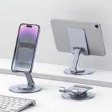 نگهدارنده موبایل رومیزی یوسمز مدل Zj074 یک هولدر رومیزی با کیفیت میباشد که که از جنس آلیاژ آلومینیوم ساخته شده است و به همین دلیل مقاومت بالایی در برابر ضربه و فشار را دارد. هولدر موبایل رومیزی یوسمز مدل Zj074 از دو قسمت تشکیل شده که قابلیت تاشو دارد.می توانید به راحتی آن را جمع کرده و با خود حمل کنید. هولدر رومیزی موبایل یوسامز بر روی یک سطح قابل چرخیدن قرار دارد و تا 360 درجه قابلیت چرخش را دارد.همچنین بر روی سطوح پشت و پایه های این هولدر از روکش سیلیکون با کیفیت به کار فته است تا از آسیب رسیدن و خط و خش بر روی گوشی جلوگیری شود. با توجه به نوع طراحی این هولدر میتوانید آن را در ارتفاع های مختلف هم تنظیم کنید. ابعاد پایه نگهدارنده موبایل رومیزی یوسمز 105×110x185 میلی متر بوده و قسمت نگه دارنده آن مناسب گوشی و تبلت هایی از ابعاد 5 الی 14 اینچ میباشد. هولدر تبلت رومیزی Usams Zj074 مناسب برای کسانی میباشد از گوشی خود زیاد استفاده میکنند و بسیار مناسب فیلم دیدن و تولید محتوا میباشد.