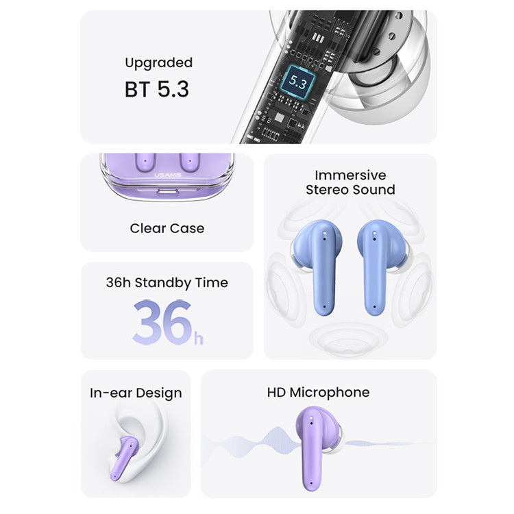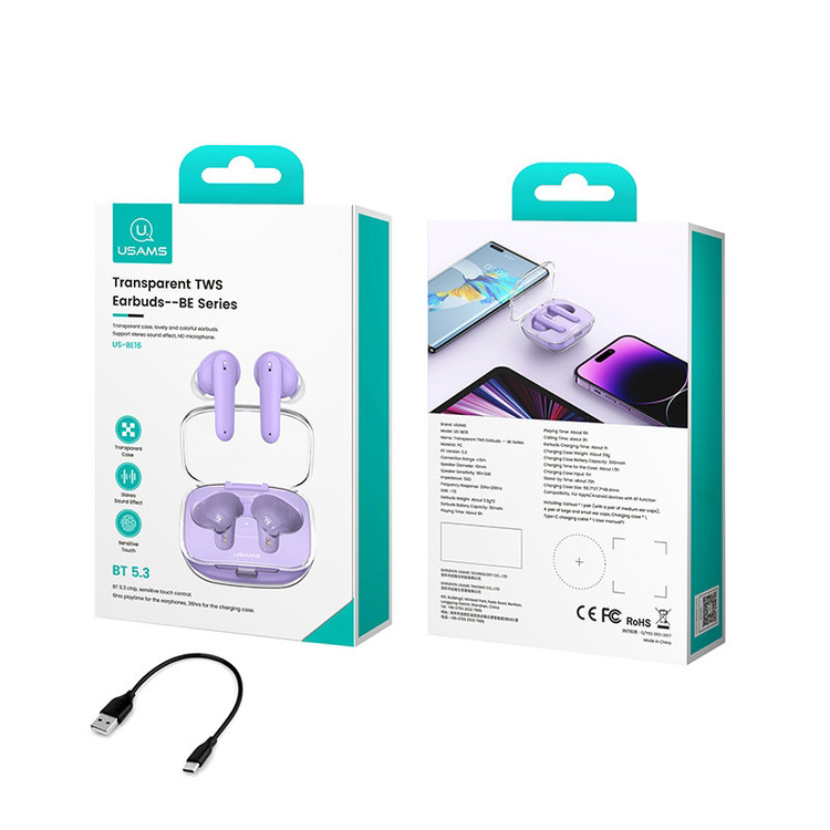 هندزفری بلوتوثی یوسمز مدل BE16 یک هندزفری بیسیم با طراحی زیبا از برند معتبر USAMS میباشد.جنس بدنه هندزفری بلوتوثی یوسمز از pc است که بدنه نسبتاً محکم و با کیفیتی دارد. ویژگی منحصر به فرد این هندزفری طراحی زیبای آن میباشد که به صورت شفاف طراحی شده است. کیس شارژ هندزفری BE16 دارای ظرفیت 300 میلی آمپر است که میتواند 3 الی 4 بار هندزفری شما را شارژ کند.مدت زمان پخش موسیقی برای این هندزفری حدود 6 ساعت (در صورت قرار دادن صدا به میزان 80 درصد) و مدت مکالمه آن حدود 3 ساعت میباشد. شما میتوانید تا 36 ساعت در صورت استفاده از کیس شارژ آن از این هندزفری استفاده کنید و نیازی به شارژ نداشته باشید. هندزفری بلوتوثی usams با توجه به اینکه از دارای میکروفون خوبی میباشد، شما میتوانید یک مکالمه با کیفیت و به صورت HD داشته باشید. با توجه به کیفیت خوب صدا و قابلیتهایی که دارد مناسب برای بازی،موسیقی و مکالمه می باشد. این هندزفری دارای اسپیکرهایی با قطر 10 میلیمتر میباشد که باعث میشود شما موسیقی را با کیفیت بالا و با بیس مناسب گوش کنید و از آن لذت ببرید. هندزفری یوسمز BE16 دارای حسگر لمسی برای برقراری تماس و مدیریت موسیقی میباشد که شما میتوانید این قابلیتها را با تعداد ضربه به قسمت حسگر استفاده کنید.(برای اطلاع از قابلیتهای حسگر میتوانید به تصاویر محصول مراجعه کنید) کیس شارژ هندزفری usams دارای ابعاد 58.7×57.7×48.4 میلیمتر میباشد که دارای سایز نسبتا مناسبی بوده که برای استفاده روزانه بسیار مناسب است. حساسیت این هندزفری 3+99 دسی بل یا 3-99 دسی بل است.قابلیت اتصال به گوشیهای اندروید و گوشیهای آیفون را داراست و نسخه بلوتوث آن 5.3 می باشد که از جدیدترین نسخههای بلوتوث می باشد و سرعت انتقال اطلاعات نسبت به نسخههای قبلی تا چند برابر بهتر انجام میشود.